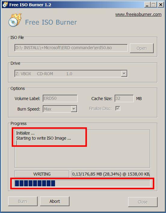 5. Начался процесс записи ISO на CD диск. Ждите, пока он не закончится. ( Следите за индикатором процесса внизу окна программы)